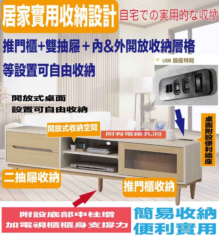 搭配採用推門櫃+二抽屜+開放層格+附插座單個等收納空間設計