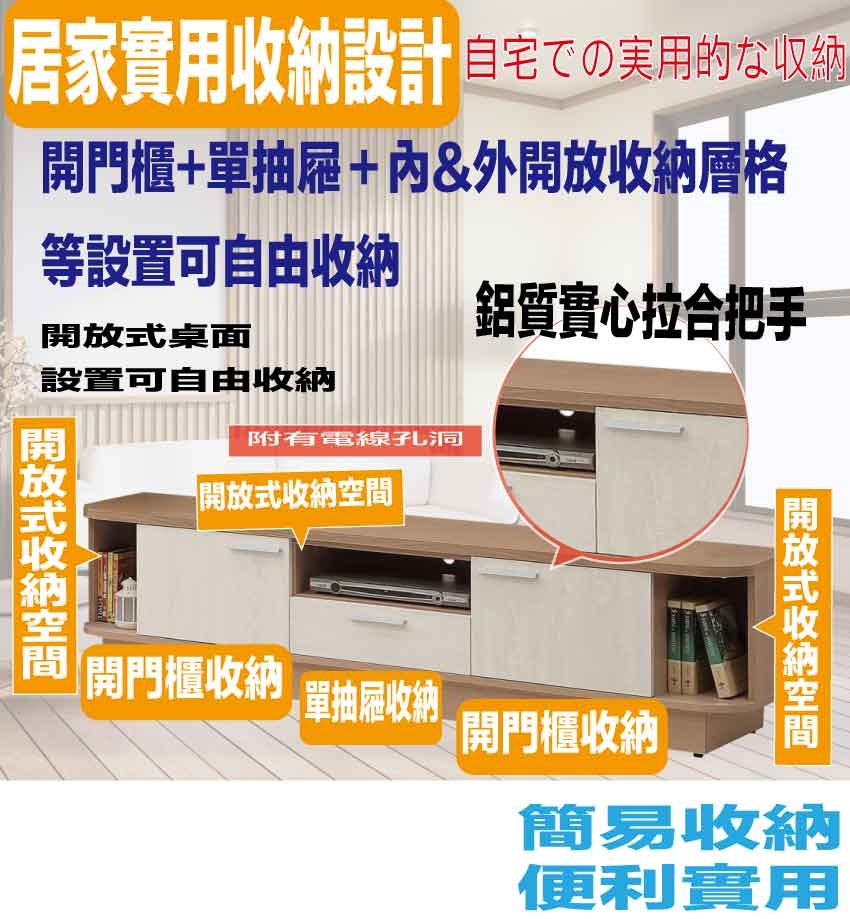 搭配採用開門櫃+單抽屜+開放層格等收納空間設計