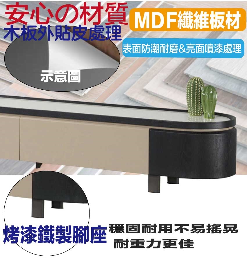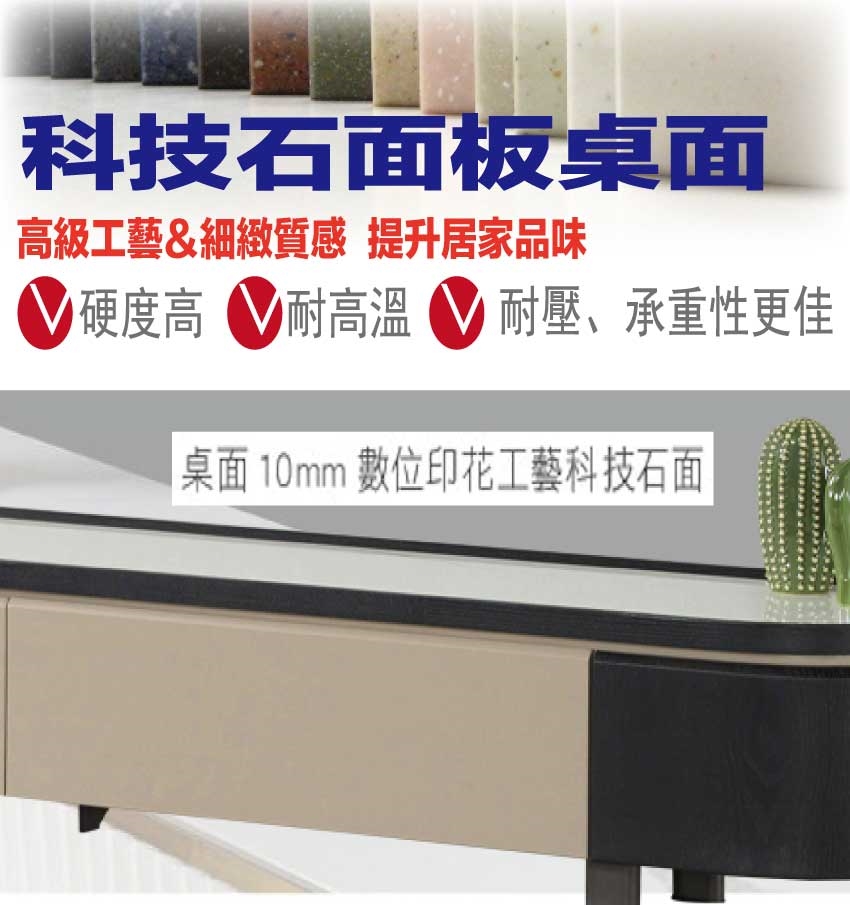 採用防潮MDF板+烤漆鐵製腳座+五金滑軌結構+科技石面桌面板等安心材質製造