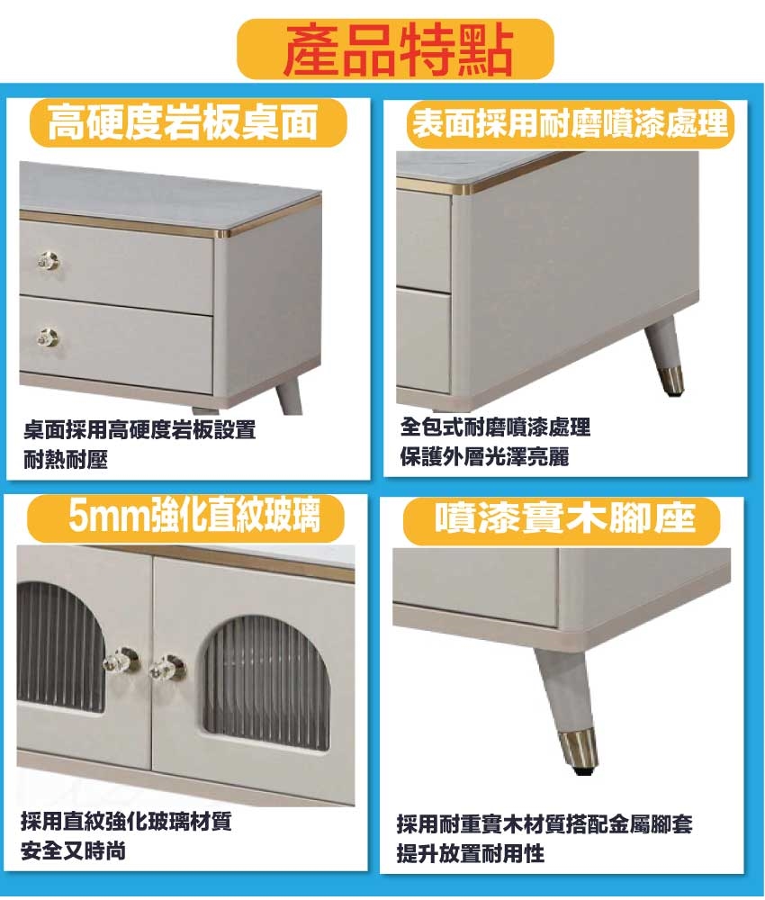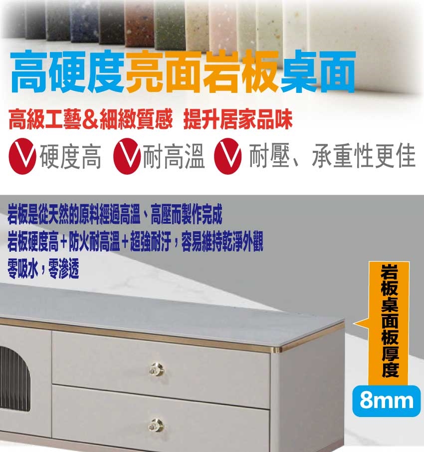 採用防潮MDF板+實木噴漆腳座&金屬腳套+五金滑軌結構+8mm高硬度岩板桌面板+長虹玻璃門片等安心材質製造