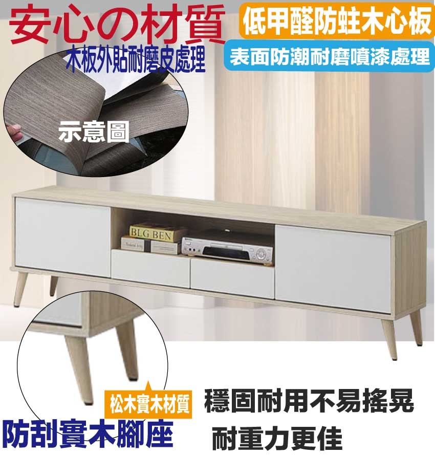 ★偏遠地區需額外加收運費,下標請先問與答詢問★ ★下訂前注意 由於商品流動較快,下訂前請先詢問是否有貨在下訂喔~★ 【綠家居】卡魯斯6.1尺二抽二門電視櫃 淺橡雙色系+安心材質製造,使用放心+搭配居家更便利,採用防蛀木心板+防刮實木腳座+防夾手緩衝五金等安心材質製造 ,外層採用防潮耐磨噴漆處理搭配採用開門櫃+二抽屜+開放式層格等收納空間設計,全由專人配送到家,專業安心服務,替你省下更多時間!