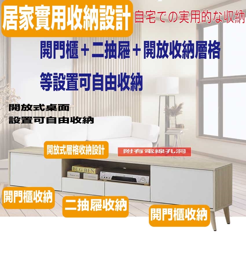 搭配採用開門櫃+二抽屜+開放式層格等收納空間設計