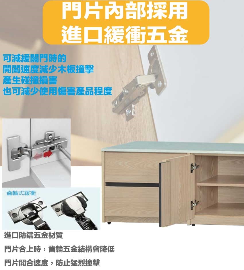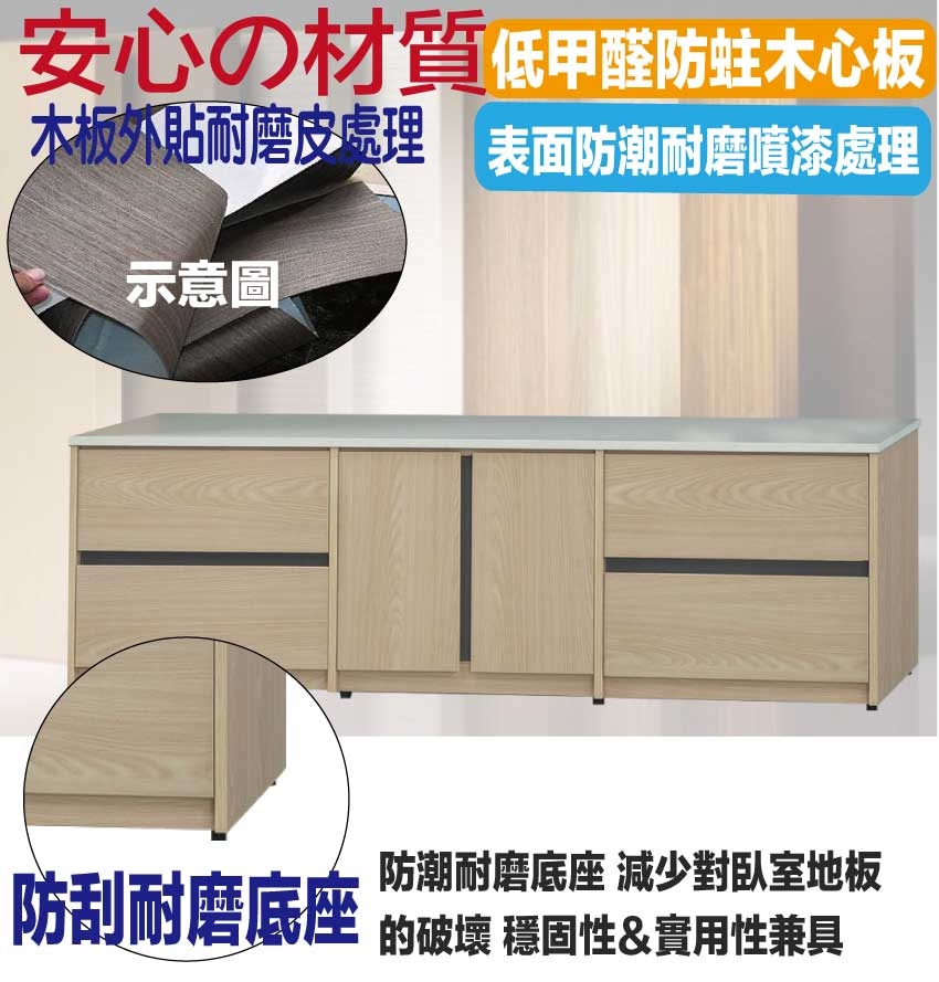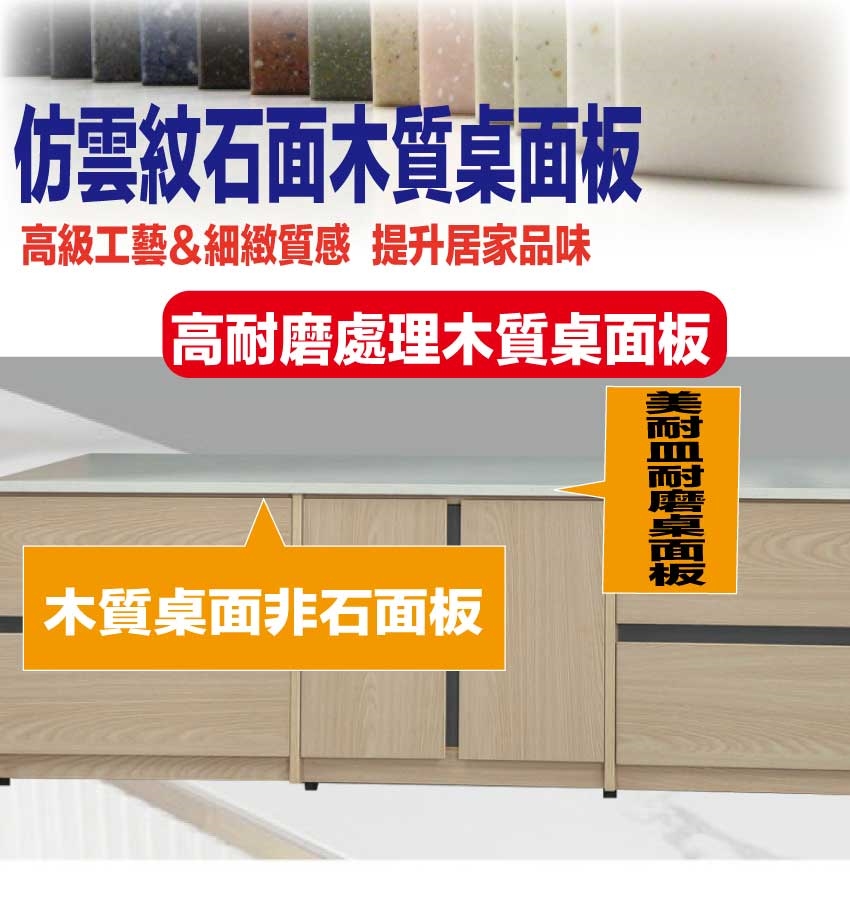 採用防蛀木心板+防潮耐磨底座+美耐皿仿雲紋石面桌面板(非石面)+防夾手緩衝五金+五金滑軌結構等安心材質製造