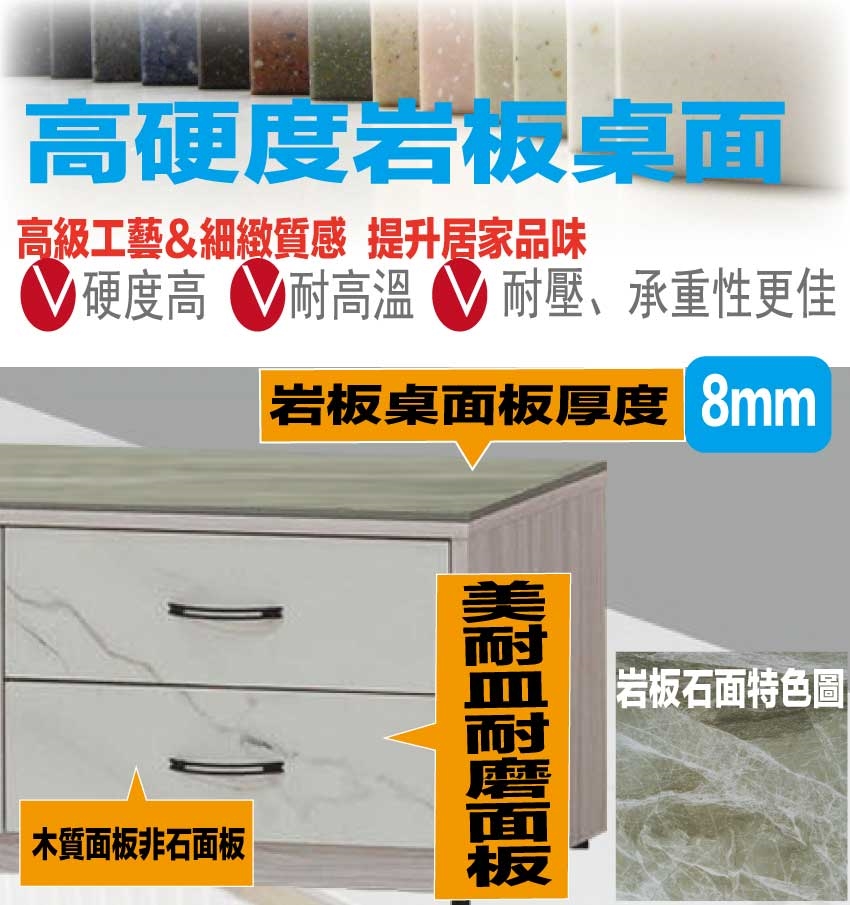 材質:防蛀木心板+防潮耐磨底座(可調高低水平)+仿大理石紋路耐磨美耐皿面板+PC壓克力門片+8mm高硬度岩板桌面板