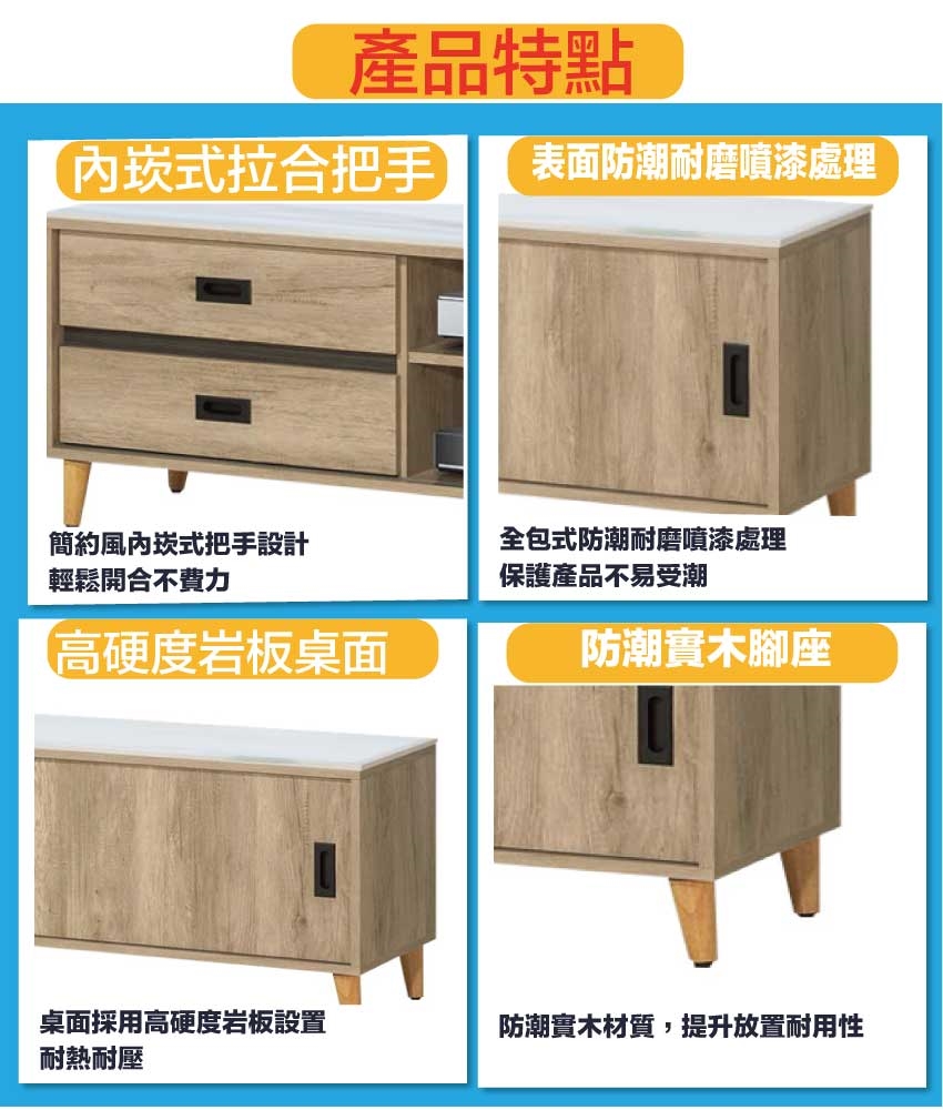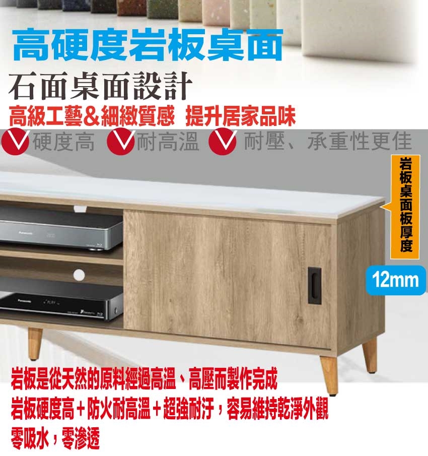 材質:防蛀木心板+實木造型腳座+12mm高硬度岩板桌面板