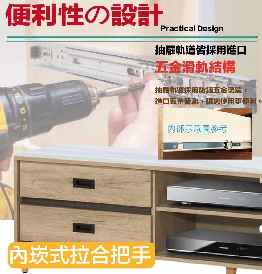 採用推門櫃+二抽屜+內&外開放層格等收納空間設計