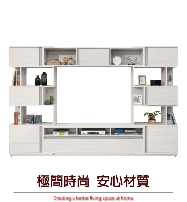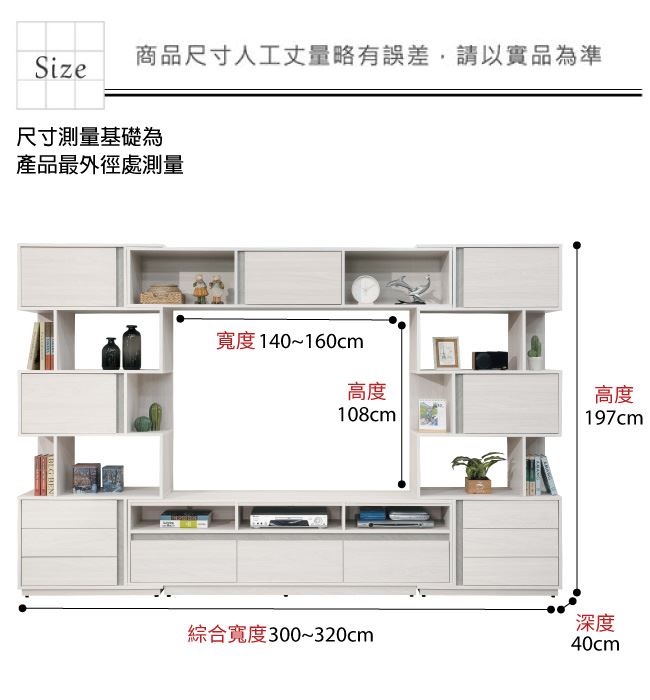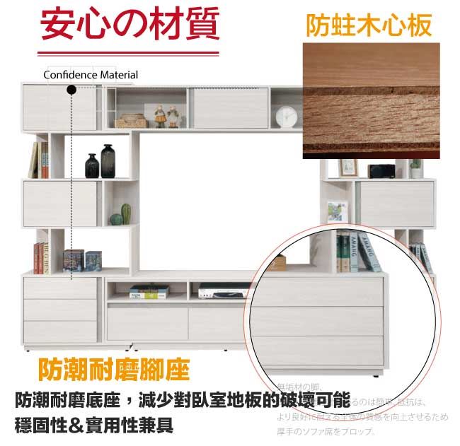材質 | ◆產品名稱:【綠家居】斯塔林10尺伸縮多功能電視牆櫃/視聽櫃組合 尺寸:(寬)300-320x(深)40(高)197公分 ◆材質: 材質:防蛀木心板+防潮耐磨腳座+五金滑軌結構 噴漆:防潮耐磨噴漆處理