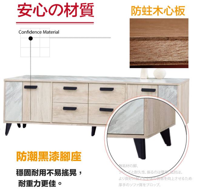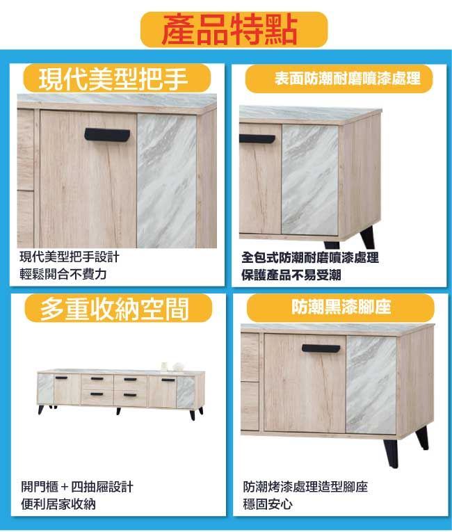 商 品 介 紹 | 【綠家居】烏美7尺二門四抽電視櫃/視聽櫃 木紋雙色系+現代簡約風格+安心材質製造,整體採用防蛀木心板+防潮黑漆腳座+五金滑軌結構+防夾手緩衝門片五金等安心材質製造,產品外層採用防潮耐磨噴漆處理搭配採用開門櫃+四抽屜+開放式收納等收納空間設計,全由專人配送到家,專業安心服務,替你省下更多時間! 【商品特色】 木紋雙色系+現代簡約風格+安心材質製造,使用放心+搭配居家更便利 採用防蛀木心板+防潮黑漆腳座+五金滑軌結構+防夾手緩衝門片五金等安心材質製造 產品外層採用防潮耐磨噴漆處理 搭配採用開門櫃+四抽屜+開放式收納等收納空間設計 此商品不需要DIY組立,此商品為組立後之成品 品質保證、專業設計、貼心服務 全由專人配送到家,專業安心服務,替您省下更多時間
