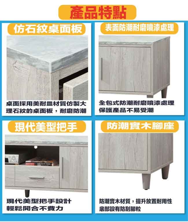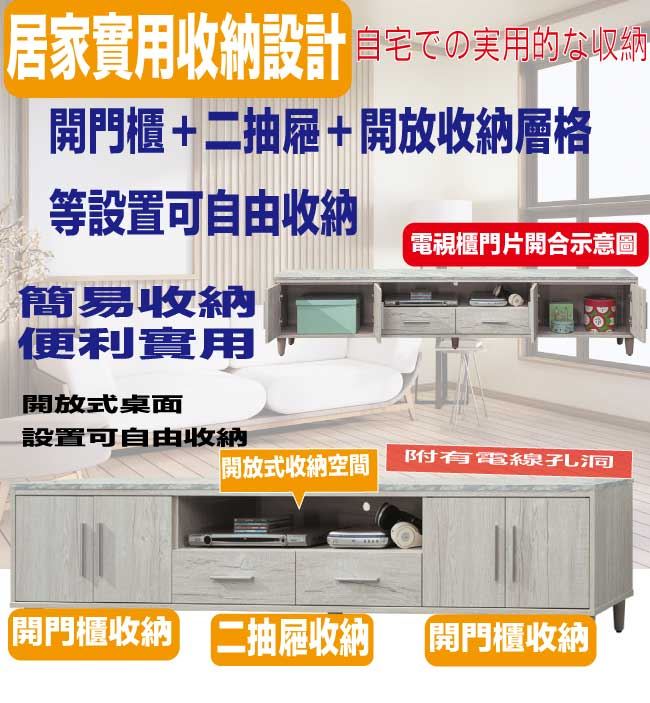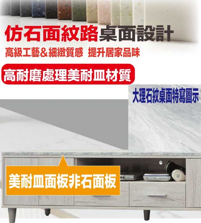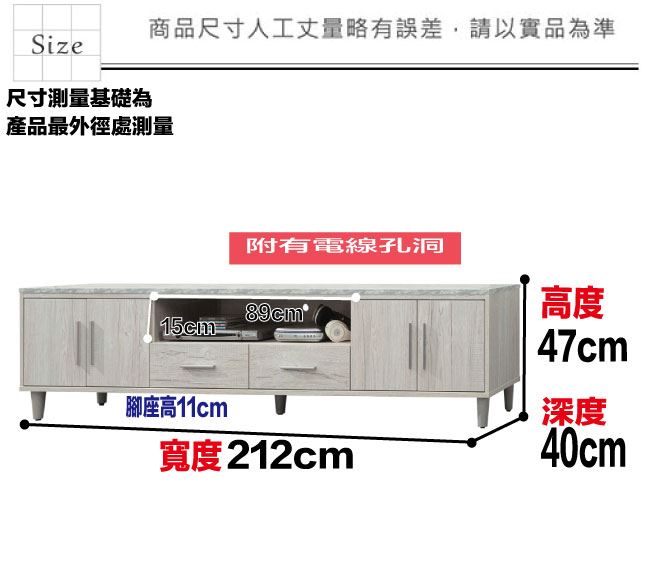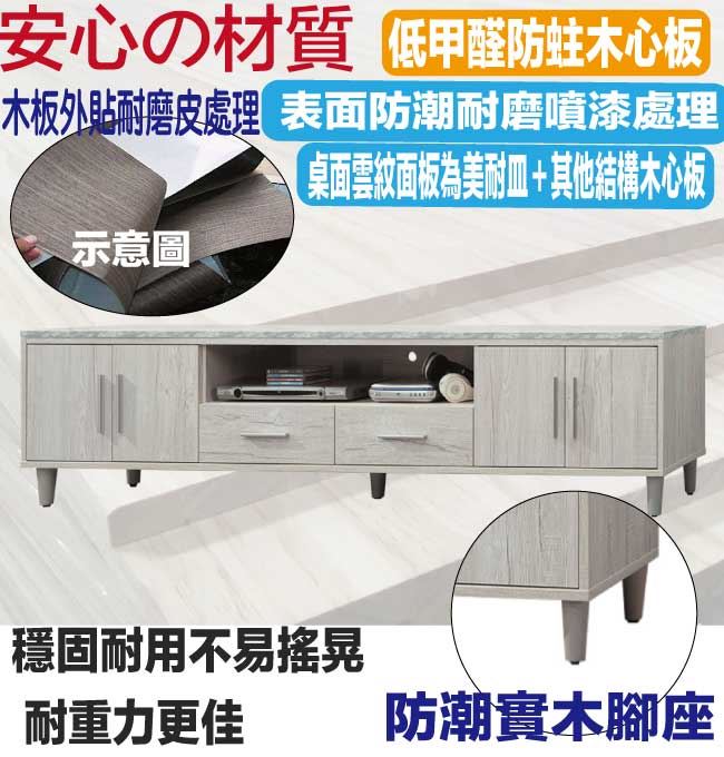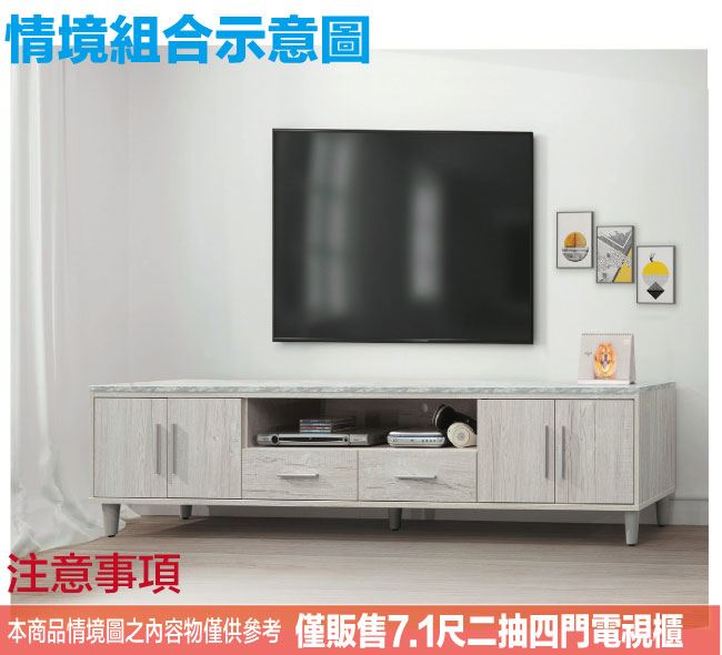 材質 | ◆產品名稱:【綠家居】艾可琳7.1尺四門二抽電視櫃 尺寸:(寬)212x(深)40x(高)47/公分 ◆材質: 材質:防蛀木心板+防潮實木腳座+五金滑軌結構+防夾手緩衝門片五金+仿大理石紋耐磨美耐皿桌面板 表面防潮耐磨噴漆處理 |