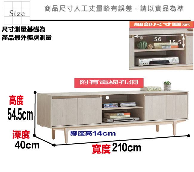 材質 | ◆產品名稱:【綠家居】斯巴雅7尺開門中空電視櫃 尺寸:(寬)210x(深)40(高)54.5/公分 ◆材質: 材質:防蛀木心板+防潮實木腳座+防夾手緩衝門片五金 表面防潮耐磨噴漆處理 |