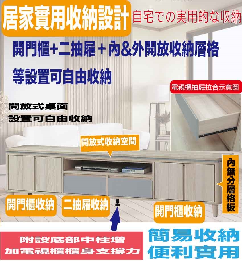 搭配採用開門櫃+二抽屜+開放層格等收納空間設計