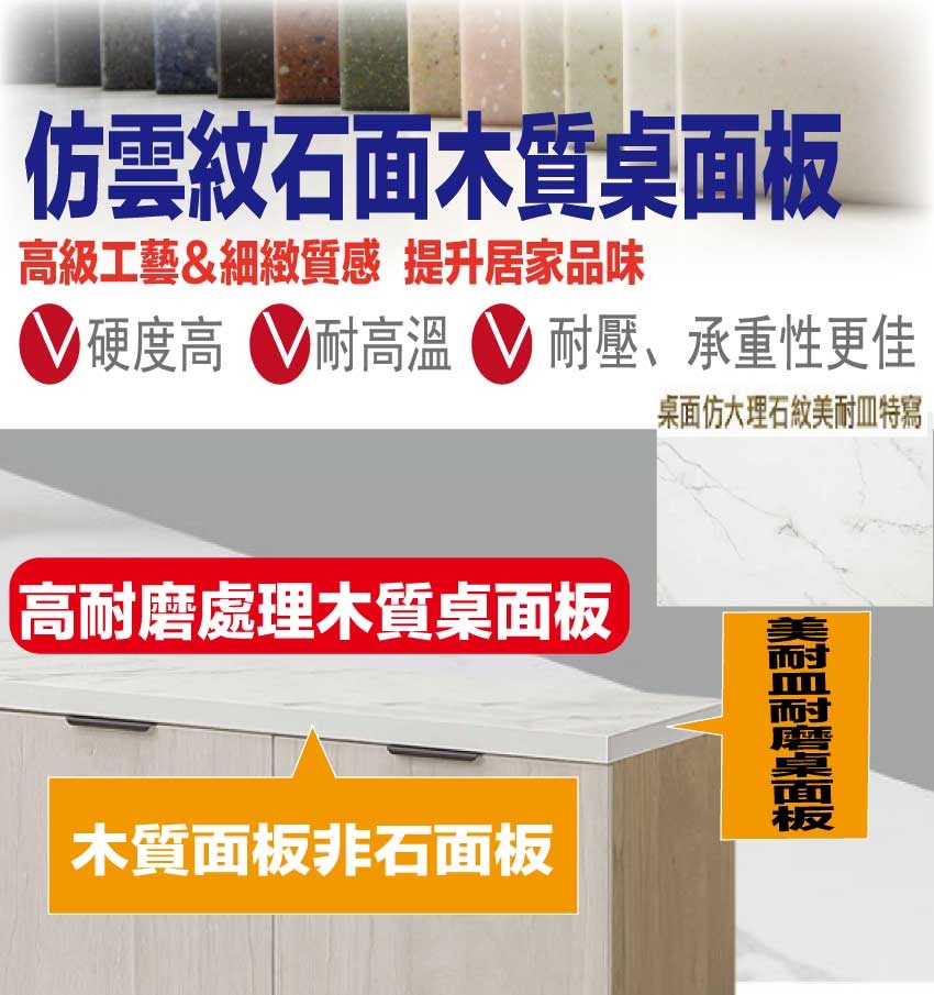 材質:防蛀木心板+防潮耐磨底座+五金滑軌結構+防夾手緩衝門片五金+仿大理石紋美耐皿桌面板