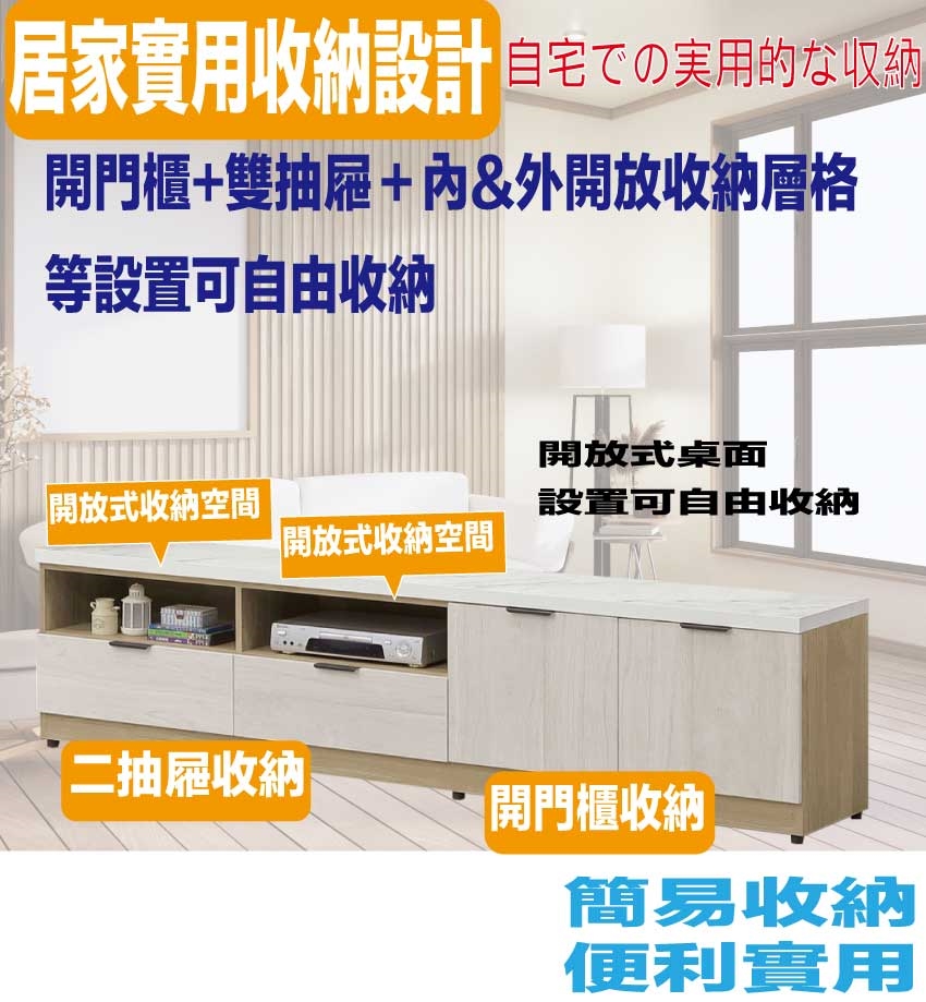 搭配採用開門櫃+二抽屜+開放層格等收納空間設計