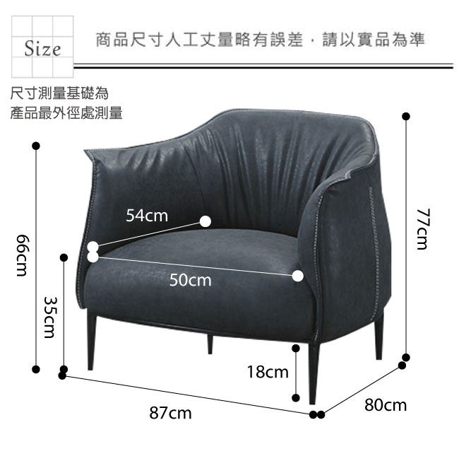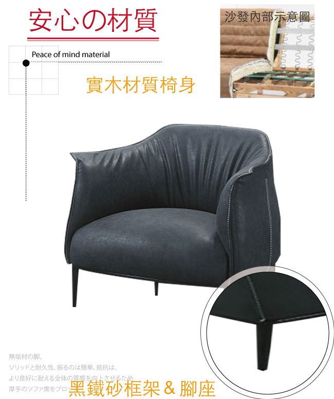 商品介紹 | 【綠家居】提菲芮 工業風深灰仿舊皮革單人座沙發椅 工業風深灰色系+現代美型外觀+安心材質設計,就是這種頂級質感的設計,能輕鬆地融入各種空間風格,採用松木實木骨架&椅身+黑鐵砂腳座+深灰仿舊皮革(表面仿舊皺摺工藝技術)+高密度三層式泡棉等安心材質,品質安心有保障,現在購買專人送到府服務,免組裝+免運費,讓你省時省力省運費! 【商品特色】 工業風深灰色系+現代美型外觀+安心材質設計 松木實木骨架&椅身+黑鐵砂腳座+深灰仿舊皮革(表面仿舊皺摺工藝技術)+高密度三層式泡棉等安心材質 專人送貨到府免組裝免運費服務,讓您省時又便利 |