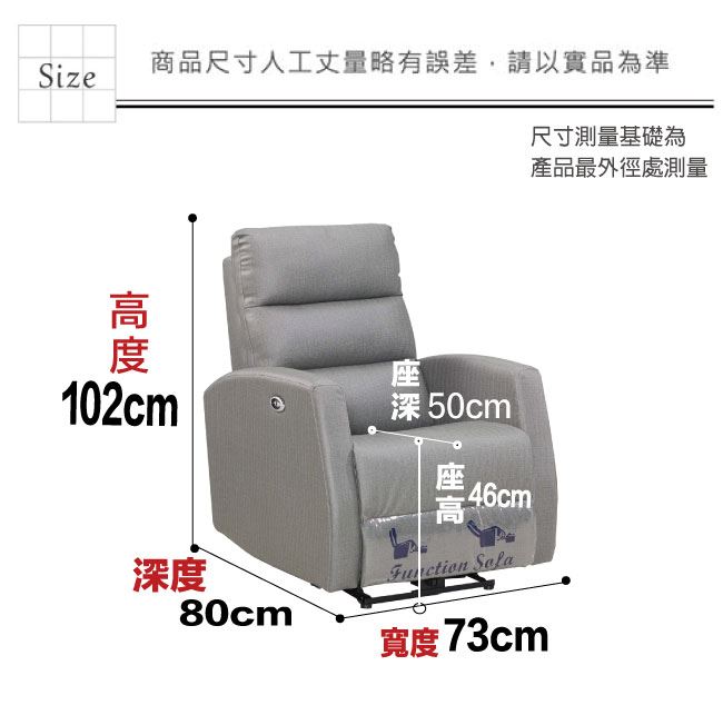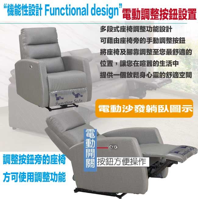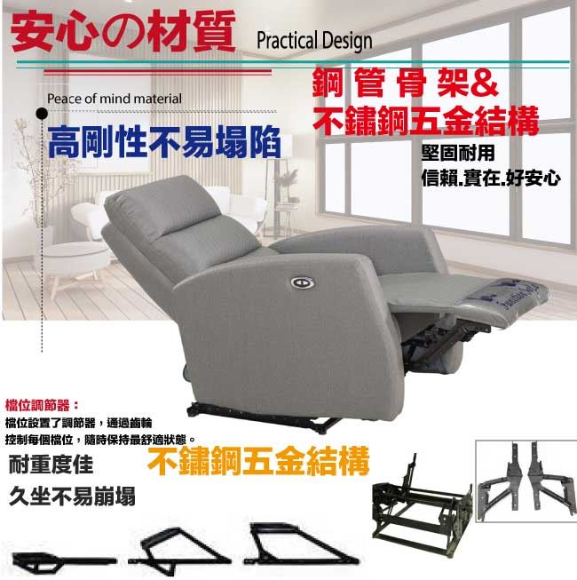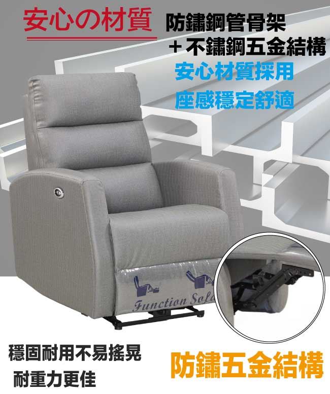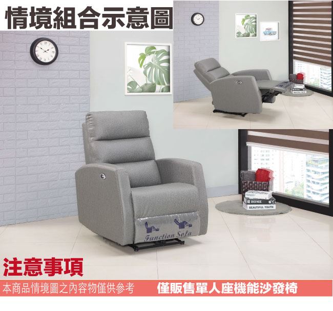 商品 介紹 | 【綠家居】米姆貓抓皮革機能性單人座沙發(電動開關調整) 時尚灰色系+現代美型外觀+安心材質設計,就是這種頂級質感的設計,能輕鬆地融入各種空間風格,採用防鏽鋼管骨架+防鏽不鏽鋼五金結構+耐磨貓抓皮革+高回彈性加厚泡棉等安心材質製造,品質安心有保障,現在購買專人送到府服務,免組裝+免運費,讓你省時省力省運費! 【商品特色】 時尚灰色系+現代美型外觀+安心材質設計 沙發腳椅坐墊可上掀及椅背後仰功能設計,採用電動按鈕開關設計控制調整功能 採用防鏽鋼管骨架+防鏽不鏽鋼五金結構+耐磨貓抓皮革+高回彈性加厚泡棉等安心材質製造 專人送貨到府免組裝免運費服務,讓您省時又便利 |