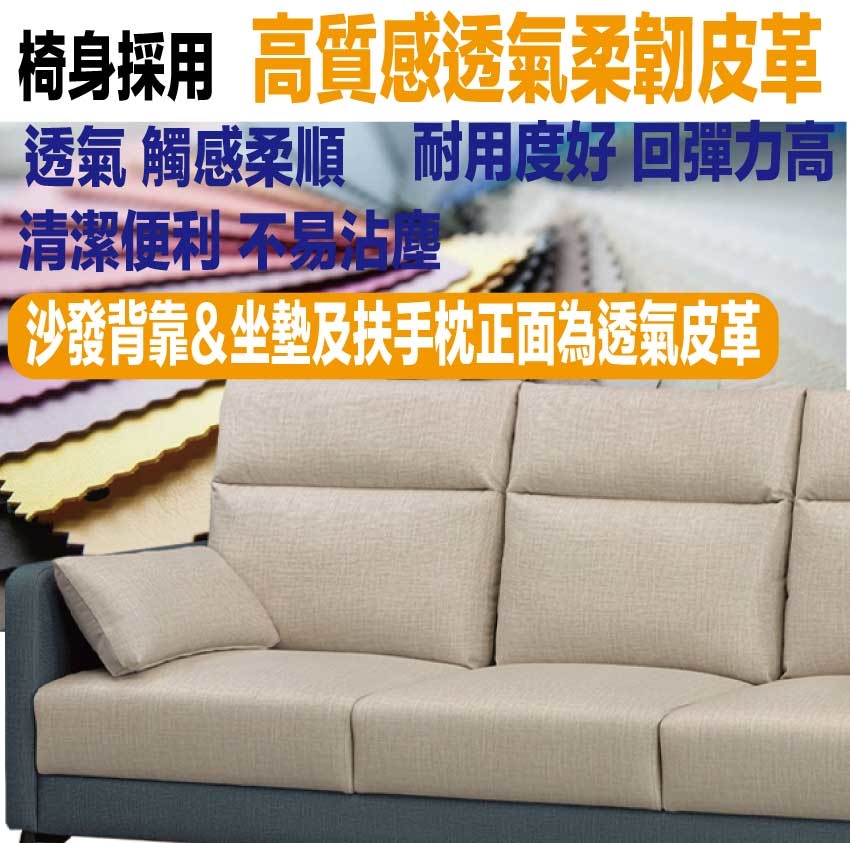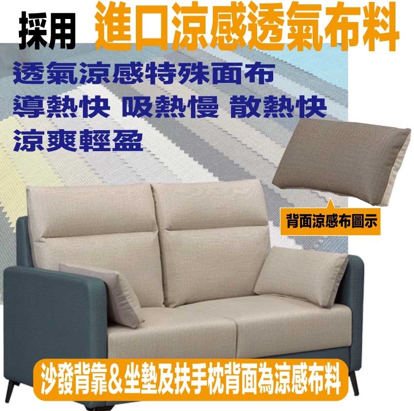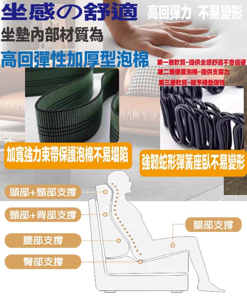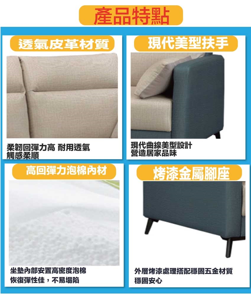 採用內部實木底框+烤漆鐵管腳座+透氣柔韌皮革+進口透氣涼感布+高回彈泡棉等安心材質製造