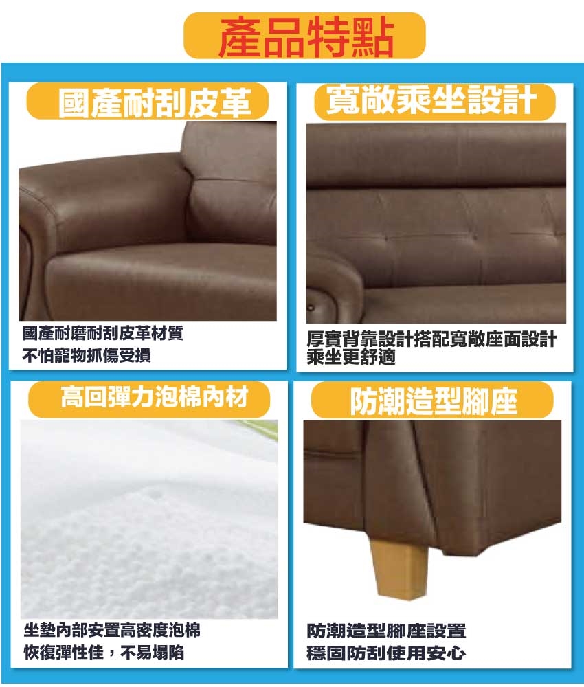 採用內部實木框架+耐磨造型腳座+耐磨耐刮皮革+高回彈泡棉等安心材質製造