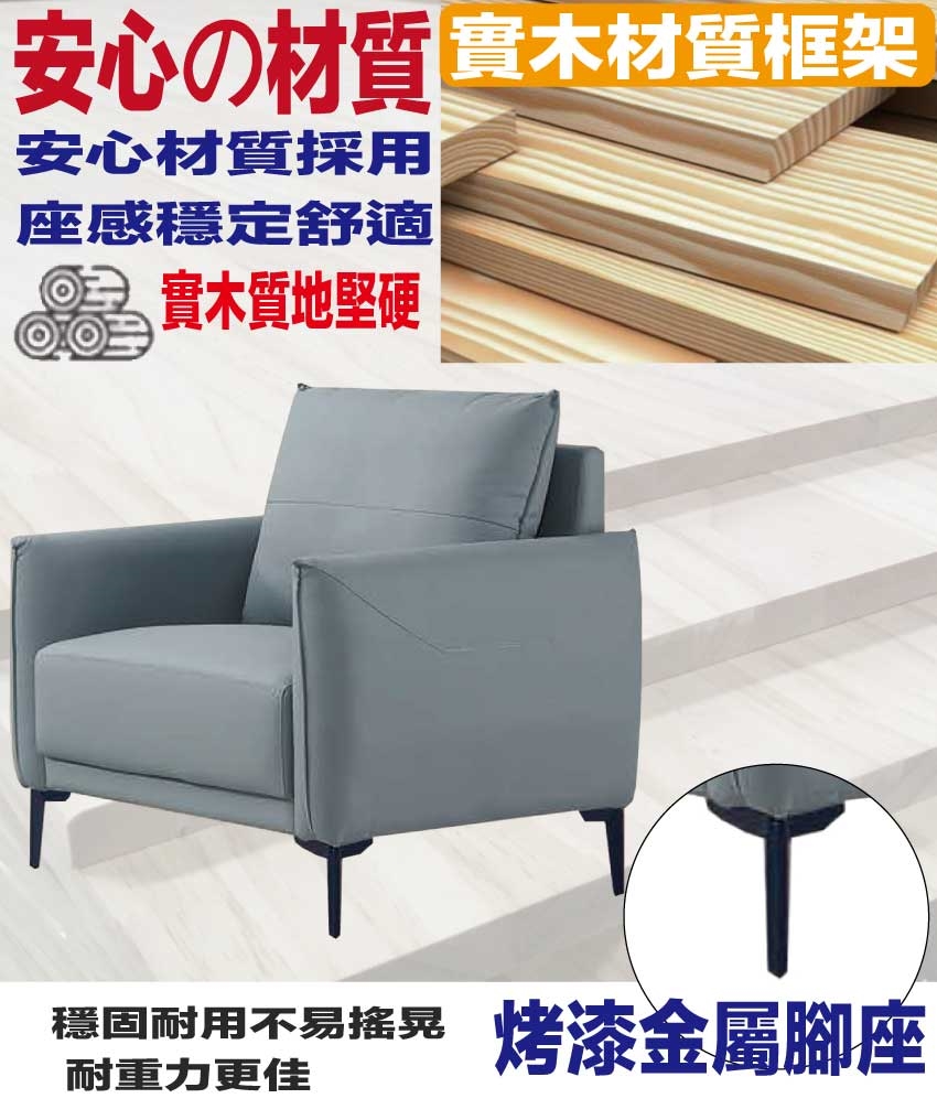 採用內部實木框架+烤漆金屬腳座+耐磨耐刮皮革+高回彈泡棉等安心材質製造