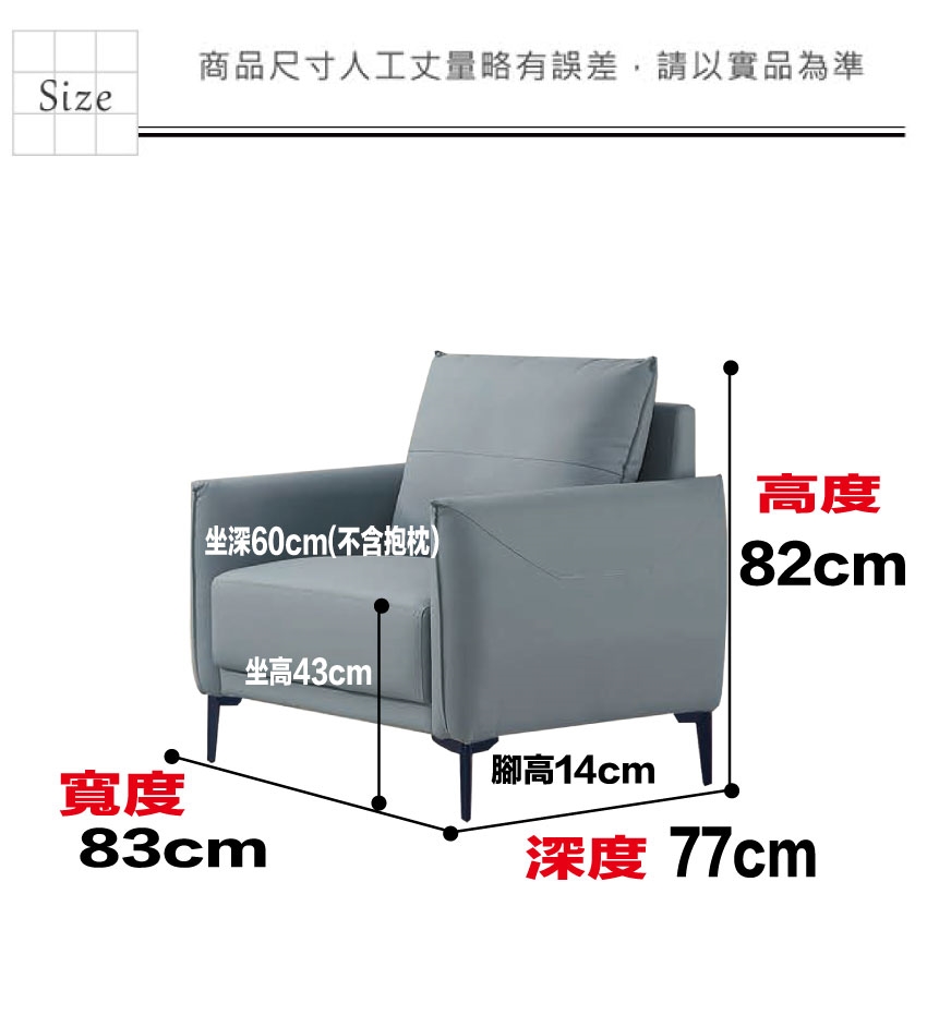產品名稱:【綠家居】莫亞克淺灰耐磨皮革單人座沙發椅 - 1人沙發椅尺寸:(寬)83x(深)77x(高)82/公分
