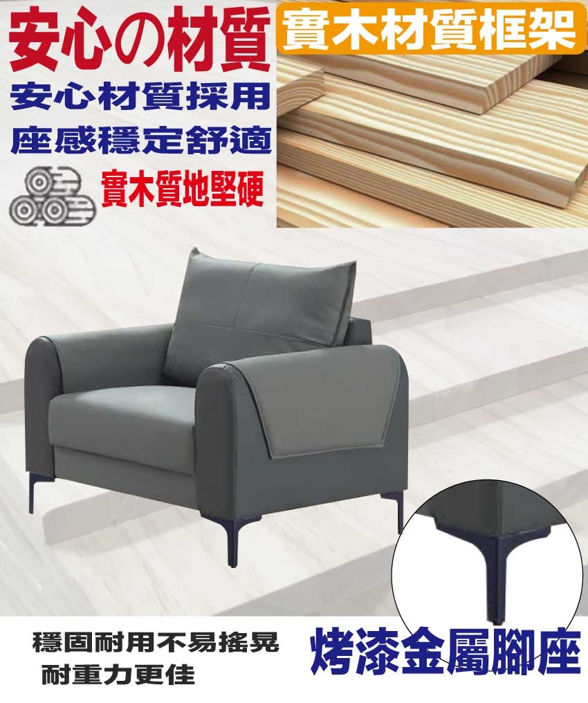 採用內部實木框架+烤漆金屬腳座+耐磨耐刮皮革+高回彈泡棉等安心材質製造