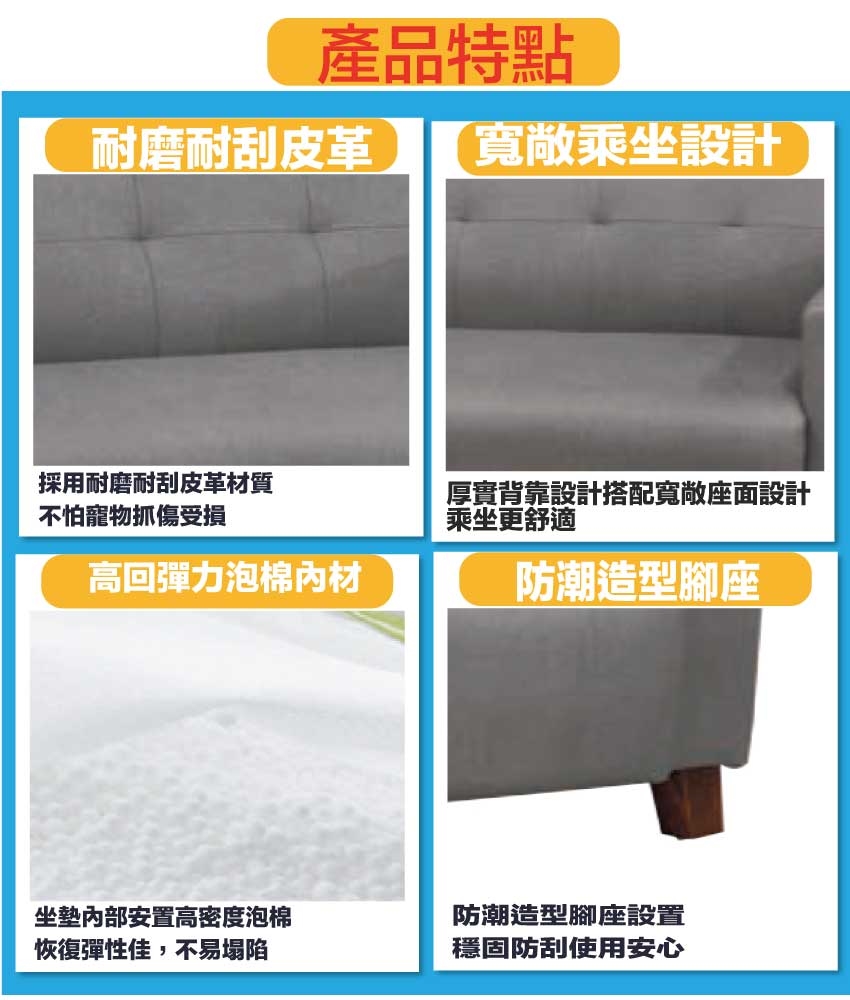 採用內部實木框架+耐磨造型腳座+耐磨耐刮皮革+高回彈泡棉等安心材質製造