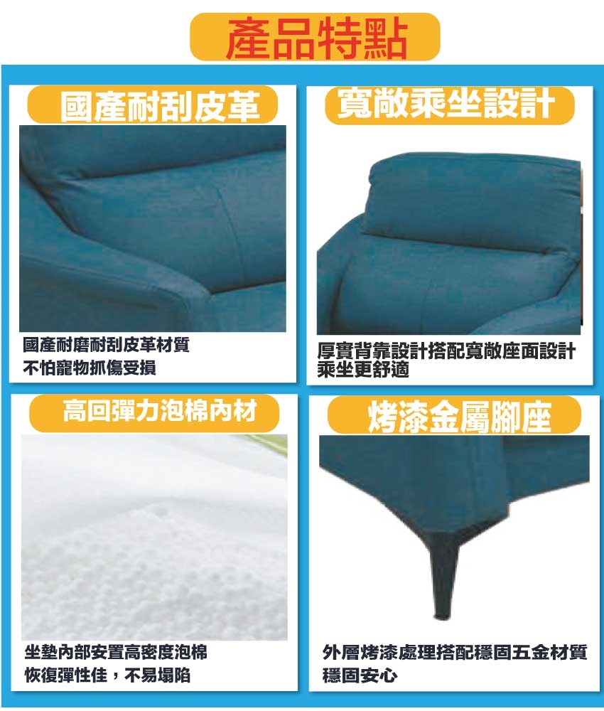 採用內部實木底框+烤漆金屬腳座+耐磨耐刮皮革+高回彈泡棉+獨立筒彈簧座包等安心材質製造