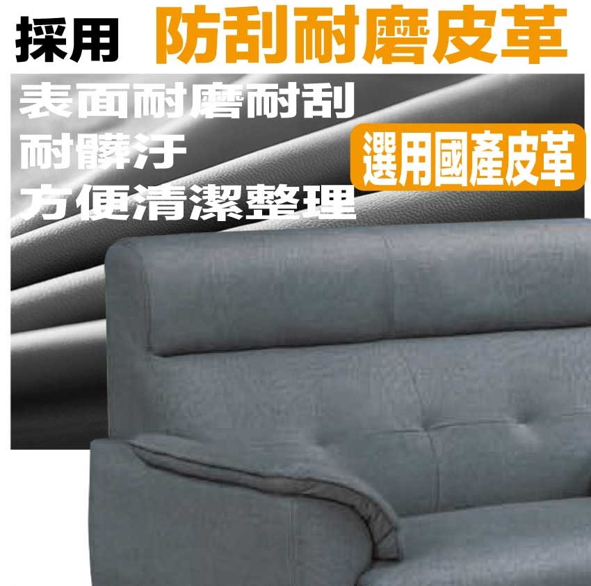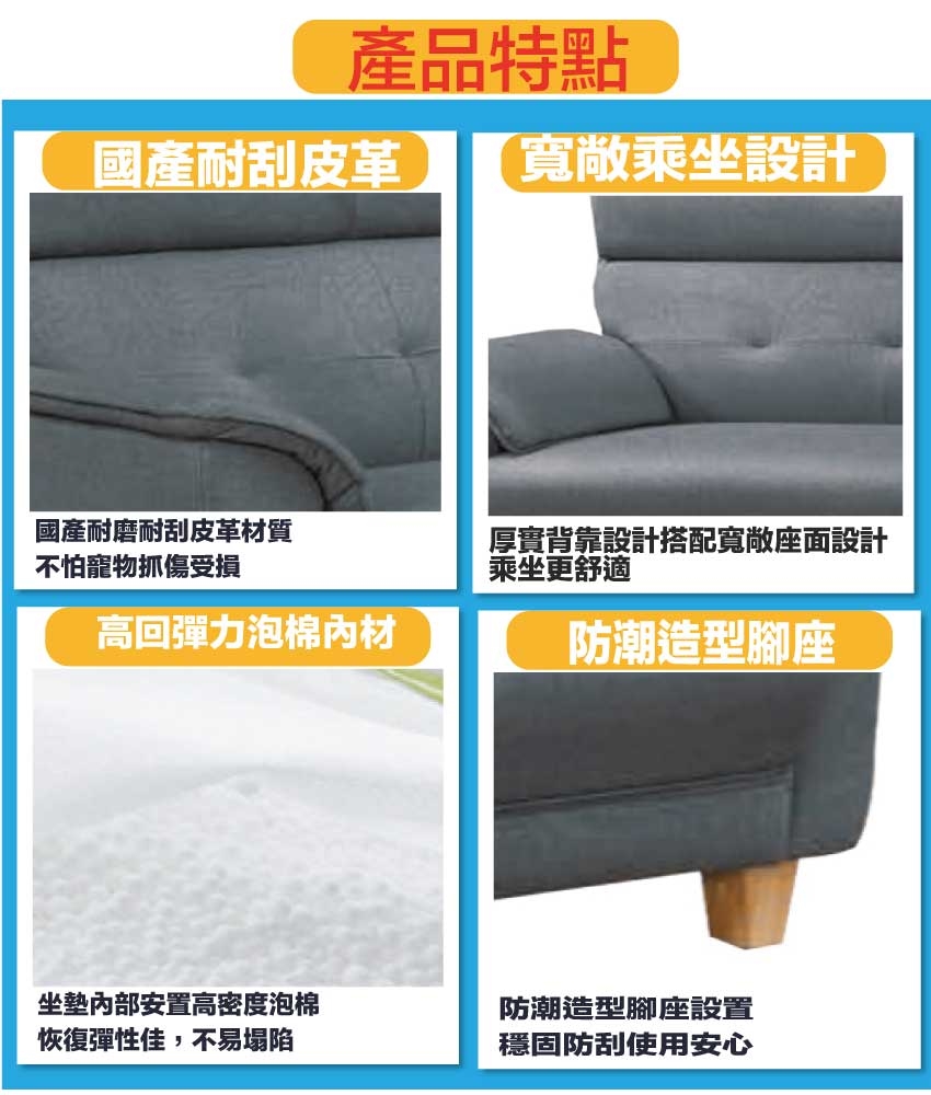 採用內部實木框架+耐磨造型腳座+耐磨耐刮皮革+高回彈泡棉等安心材質製造