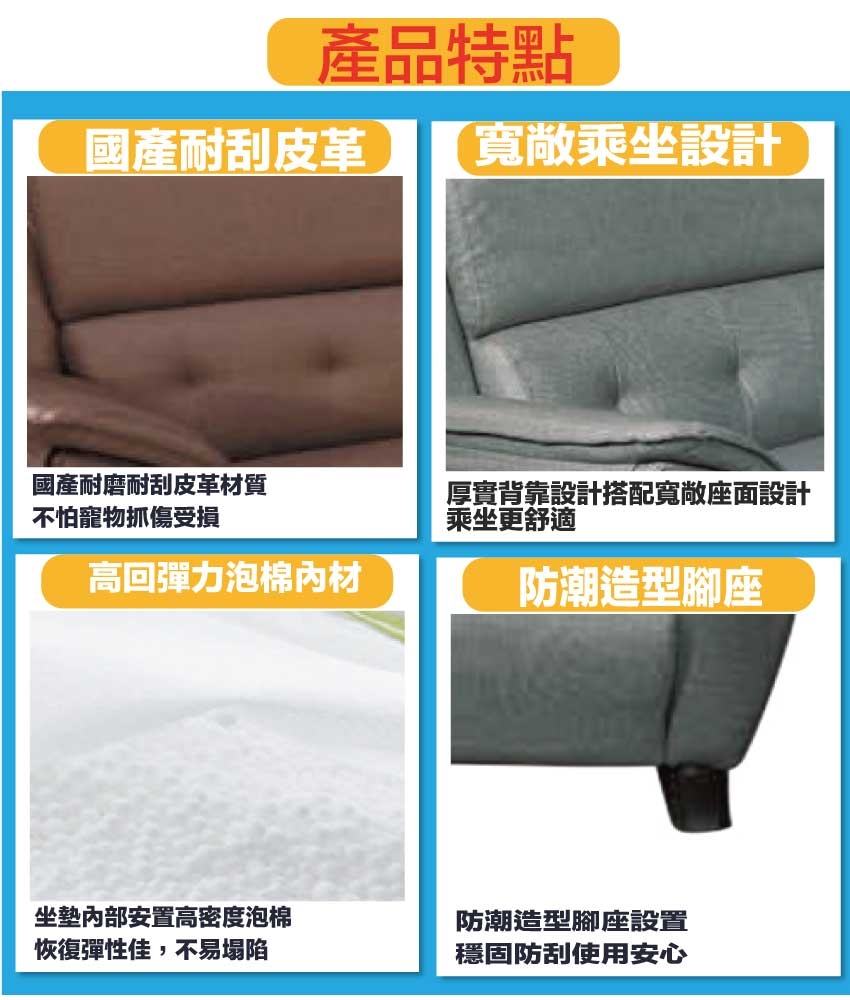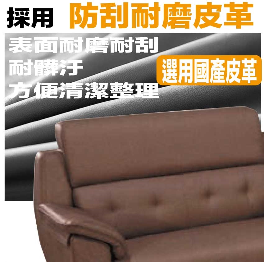 採用內部實木框架+耐磨造型腳座+耐磨耐刮皮革+高回彈泡棉等安心材質製造