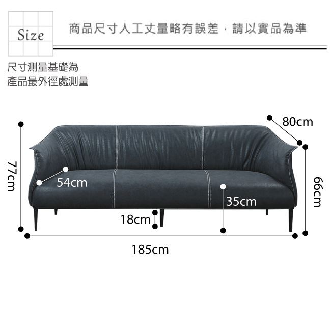 材質 | ◆產品名稱: 【綠家居】提菲芮 工業風深灰仿舊皮革三人座沙發椅 產品尺寸: 三人座尺寸:(寬)185x(深)80x(高)77/公分 材質:桐木實木骨架椅身+黑鐵砂腳座 布料:深灰仿舊皮革(表面仿舊皺摺工藝技術) 坐墊:三層式高密度泡棉+絲棉