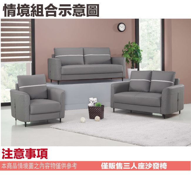 商品 介紹 | 【綠家居】馬迪尼透氣皮革三人座沙發椅 時尚灰色系+現代美型外觀+安心材質設計,就是這種頂級質感的設計,能輕鬆地融入各種空間風格,採用實木骨架椅身+防鏽黑漆五金腳座+透氣柔韌皮革+高回彈性加厚泡棉等安心材質製造,品質安心有保障,現在購買專人送到府服務,免組裝+免運費,讓你省時省力省運費! 【商品特色】 時尚灰色系+現代美型外觀+安心材質設計 採用實木骨架椅身+防鏽黑漆五金腳座+透氣柔韌皮革等安心材質製造 專人送貨到府免組裝免運費服務,讓您省時又便利 |