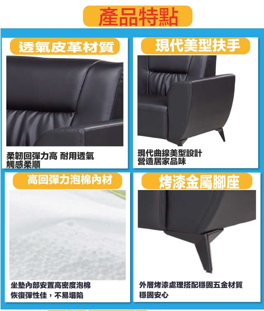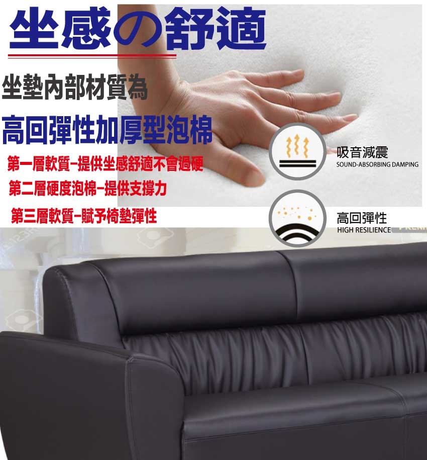 採用內部實木板材底框+烤漆金屬腳座+透氣柔韌皮革+高回彈泡棉等安心材質製造
