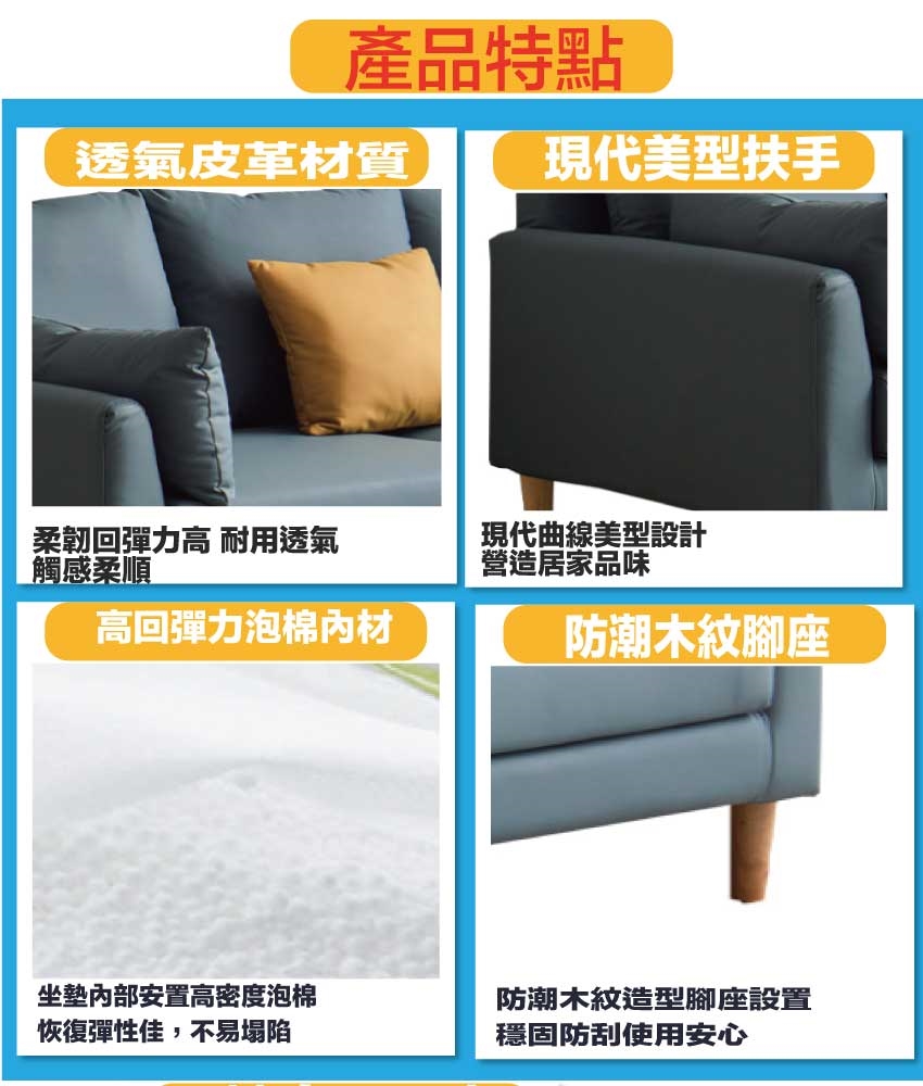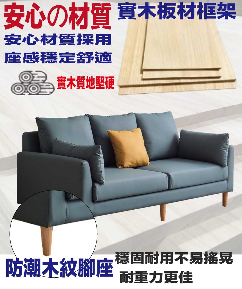 採用內部實木板材底框+防潮木紋腳座+透氣柔韌皮革+高回彈泡棉等安心材質製造