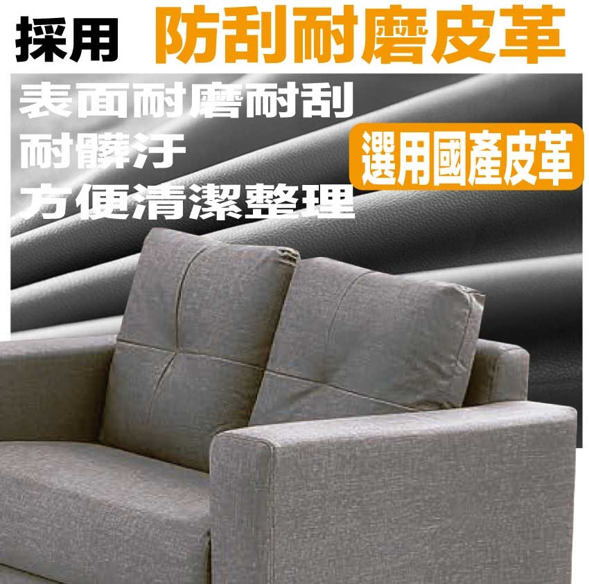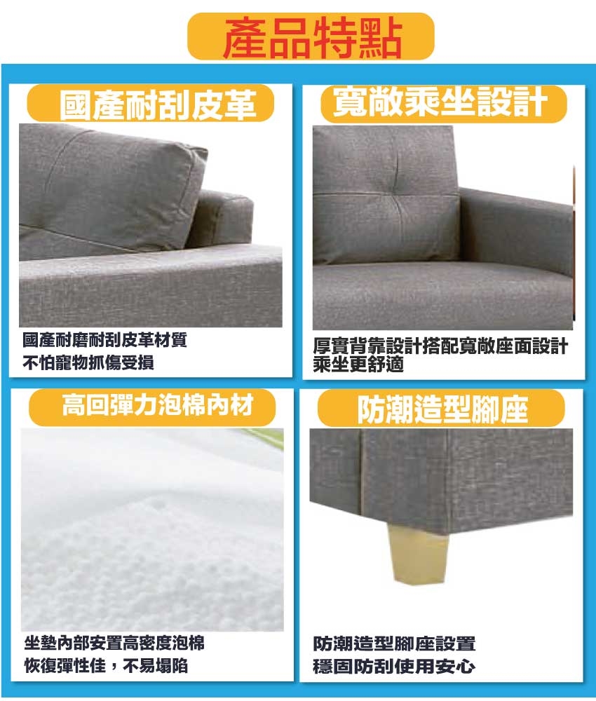 採用內部實木框架+耐磨造型腳座+耐磨耐刮皮革+高回彈泡棉+獨立筒彈簧座包等安心材質製造