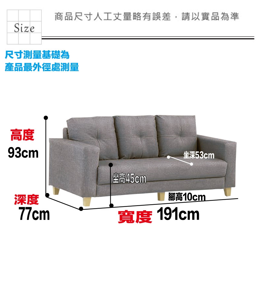 3人沙發椅尺寸:(寬)191x(深)77x(高)93/公分
