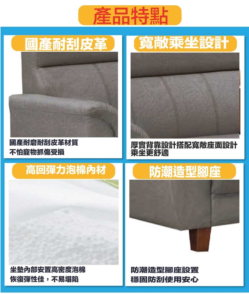採用內部實木框架+耐磨造型腳座+耐磨耐刮皮革+高回彈泡棉等安心材質製造