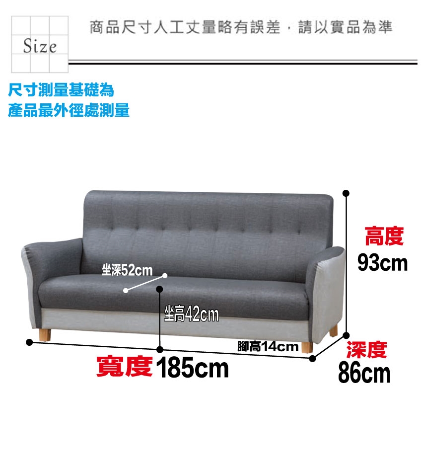 3人沙發椅尺寸:(寬)185x(深)86x(高)93/公分
