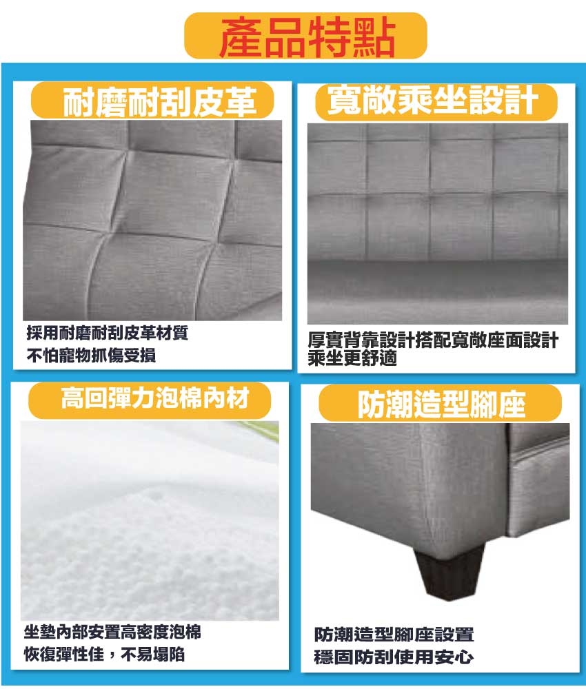 採用內部實木框架+耐磨造型腳座+耐磨耐刮皮革+高回彈泡棉+獨立筒彈簧座包等安心材質製造