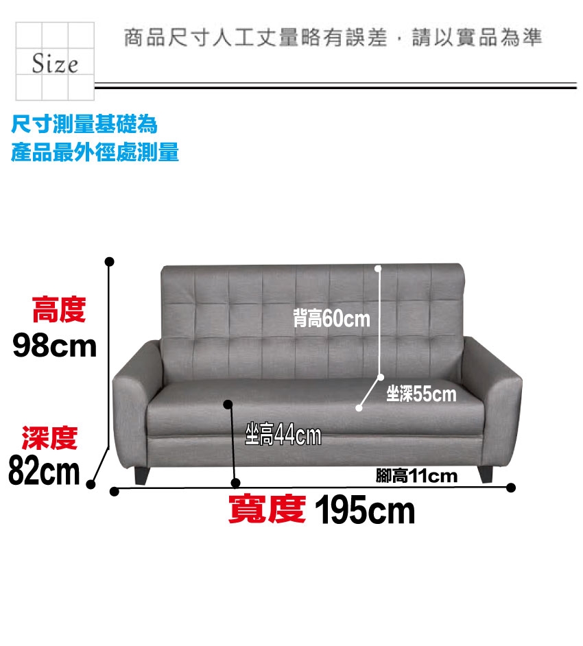 3人沙發椅尺寸:(寬)195x(深)82x(高)98/公分