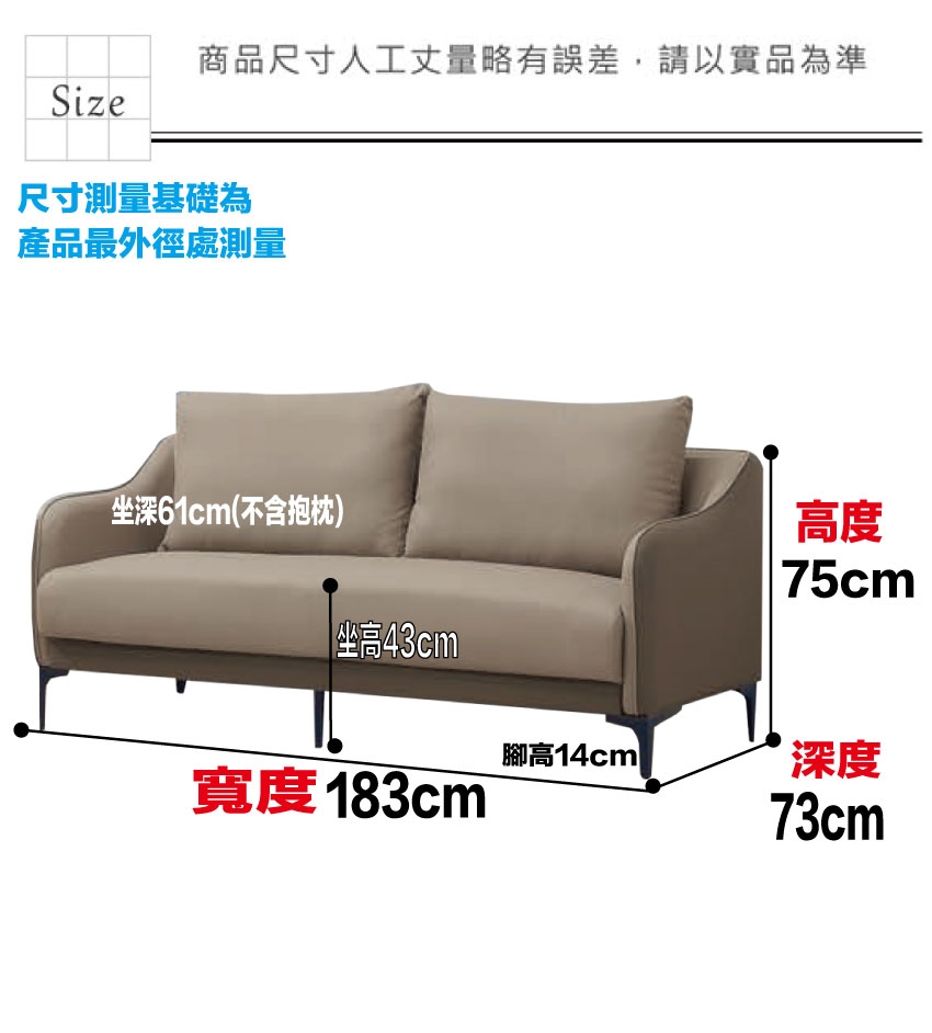 3人沙發椅尺寸:(寬)183x(深)73x(高)75/公分