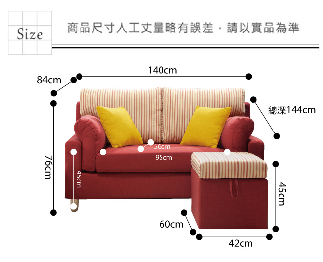 商品規格 產品名稱:【綠家居】亞力 時尚紅亞麻布獨立筒L型沙發組合(雙人座+收納腳椅) 產品尺寸: 全組沙發:(寬)140 x(深)144 x(高)76 /公分 雙人座沙發:(寬)140 x(深)84 x(高)76 /公分 坐寬:95 坐深:56 坐高:45 /公分 收納式腳椅:(寬)42 x(深)60 x(高)45 /公分 材質:桐木實木椅身+實木獨立腳座 布料:高透氣亞麻布椅套 坐墊:高密度泡棉+絲棉+獨立筒彈簧商品編號 | 尺寸 | 顏色 | 組裝方式 |