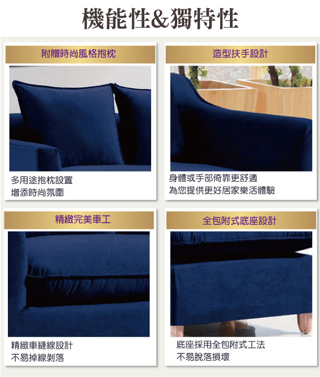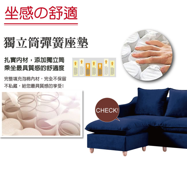 【綠家居】黛娜 時尚藍絲絨布獨立筒L型沙發組合(三人座+腳椅) 充滿現代風格的藍色系設計+簡約曲線造型+精緻車縫線+曲線扶手+寬厚椅背等設計,三人座+腳椅的二向任意選搭的設計,就是這種頂級質感的設計,能輕鬆地融入各種空間風格,沙發採用桐木實木椅身材質耐用堅固,腳座為松木實木材質結構,搭配高密度泡棉+絲棉+獨立筒彈簧材質製作椅墊,坐感舒適,椅套採用可拆洗絲絨布材質搭配精緻抱枕及現代曲線整體設計,即使您身在都市的喧囂鬧區,只要回到了家,輕鬆打造溫暖舒適的居家生活,可千萬別錯過 【綠家居】黛娜 時尚藍絲絨布獨立筒L型沙發組合(三人座+腳椅) 了喔!現在購買專人送到府服務,免組裝+免運費,讓你省時省力省運費!