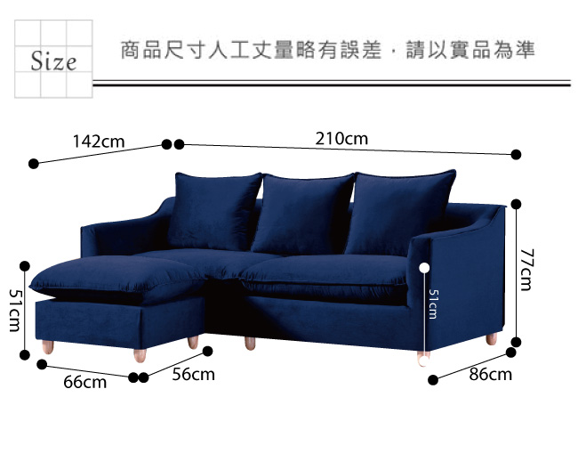 商品規格 產品名稱:【綠家居】黛娜 時尚藍絲絨布獨立筒L型沙發組合(三人座+腳椅) 產品尺寸: L型沙發:(寬)210 x(深)142 x(高)77 /公分 三人座沙發:(寬)210 x(深)86 x(高)77 /公分 坐高:51 /公分 腳椅:(寬)66 x(深)56 x(高)51 /公分 材質:桐木實木椅身+松木實木腳座 布料:可拆洗絲絨布椅套 坐墊:高密度泡棉+絲棉+獨立筒彈簧 商品編號 | 尺寸 | 顏色 | 組裝方式 |