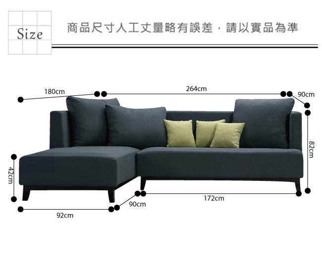 商品規格 產品名稱:【綠家居】艾德拉 時尚亞麻布獨立筒L型沙發組合(左右二向可選) 產品尺寸: L型沙發:(寬)264x (深)180x(高)82/ 公分 坐高:42 公分 材質:桐木實木椅身+實木獨立腳座 布料:可拆洗亞麻布椅套 坐墊:高密度泡棉+獨立筒彈簧 商品編號 | 尺寸 | 顏色 | 組裝方式 |