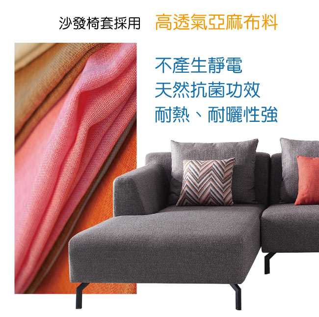 【綠家居】歐莎 時尚灰亞麻布L型沙發組合(二向可選) 沙發採用桐木實木椅身材質,耐用堅固,腳座為黑鐵砂金屬腳座,搭配高密度泡棉+絲棉材質製作椅墊,坐起來柔軟舒適,同時不會太過鬆軟,厚實有彈性,讓您輕鬆舒適,椅套採用高透氣性亞麻布搭配現代曲線整體設計 【綠家居】歐莎 時尚灰亞麻布L型沙發組合(二向可選) 由專人配送到府,專業安心服務,替你省下更多時間