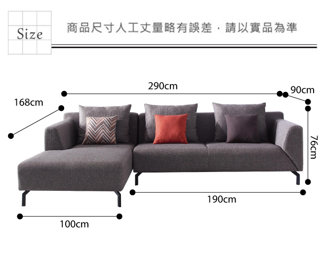 沙發尺寸:(寬)290x (深)168x (高)76 公分
