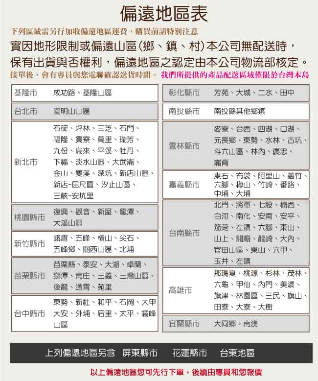 .本賣場配送僅限台灣本島地區,離外島地區傢俱部份及大型家用品恕不接受配送