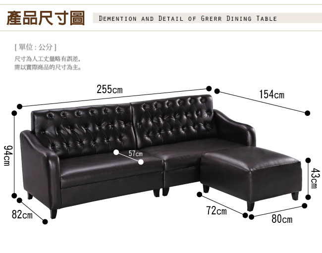 L型沙發:(寬)255x (深)154x(高)94/ 公分