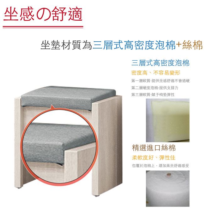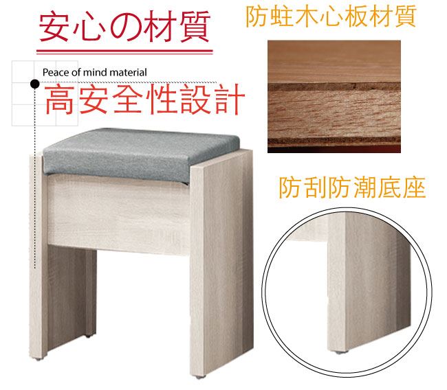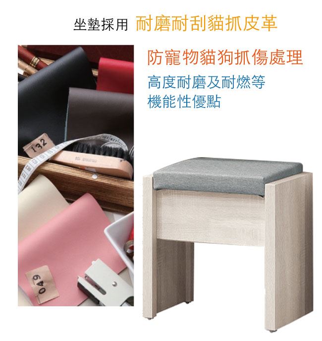 材質 | ◆產品名稱: 【綠家居】范辛頓 貓抓皮革化妝椅凳 產品尺寸: 尺寸:(寬)46x(深)30x(高)43/公分 ◆材質: 材質:防蛀木心板+防刮耐磨腳座 材質:防刮貓抓皮革+高密度泡棉 塗漆:優利坦全包式耐磨噴漆處理