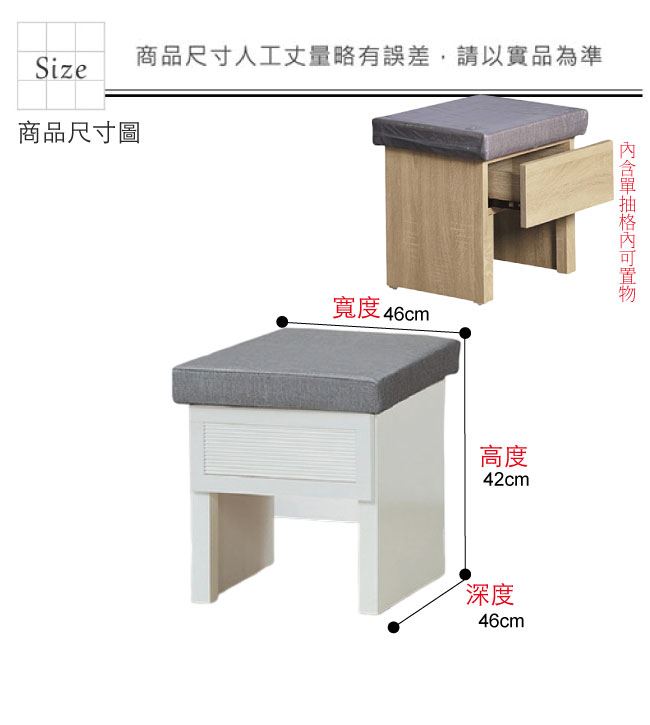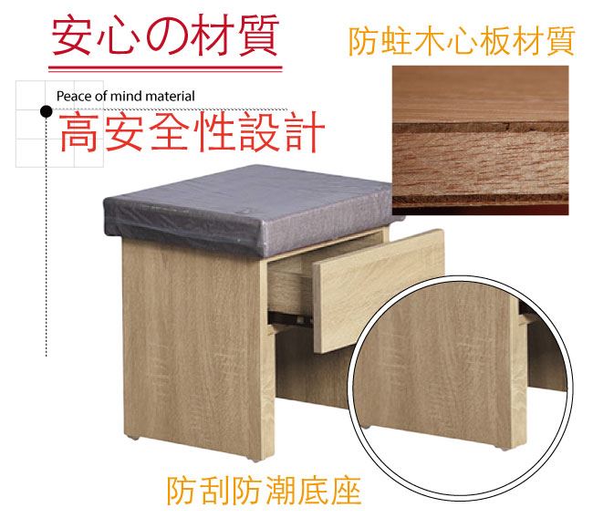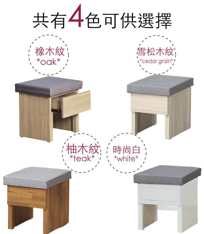 材質 | ◆產品名稱:【綠家居】欣安透氣耐磨皮革化妝椅/椅凳(四色可選+單抽格收納) 尺寸:(寬)46x(深)42(高)46/公分 ◆材質: 材質:防蛀木心板++透氣耐磨皮革+高密度泡棉+防潮耐磨底座 噴漆:防潮耐磨噴漆處理