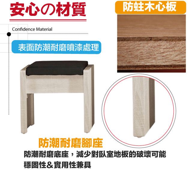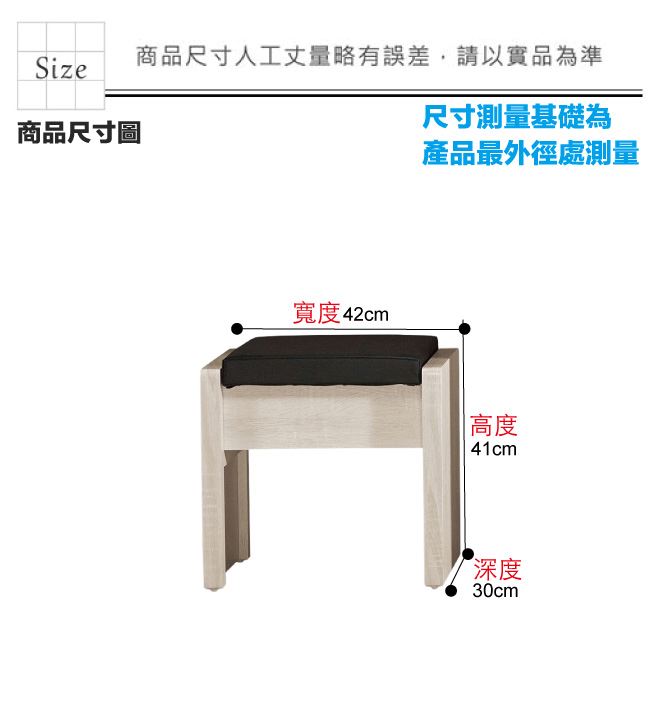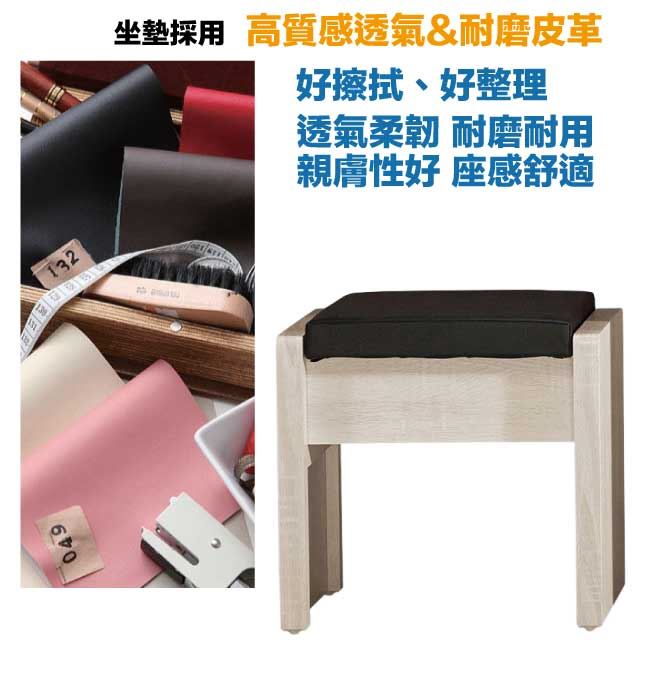 材質 | ◆產品名稱:【綠家居】艾絲莉透氣皮革可收納化妝椅(二色可選) 尺寸:(寬)42x(深)30(高)41公分 ◆材質: 材質:防蛀木心板+防潮耐磨腳座+透氣耐磨皮革+高密度泡棉 噴漆:防潮耐磨噴漆處理